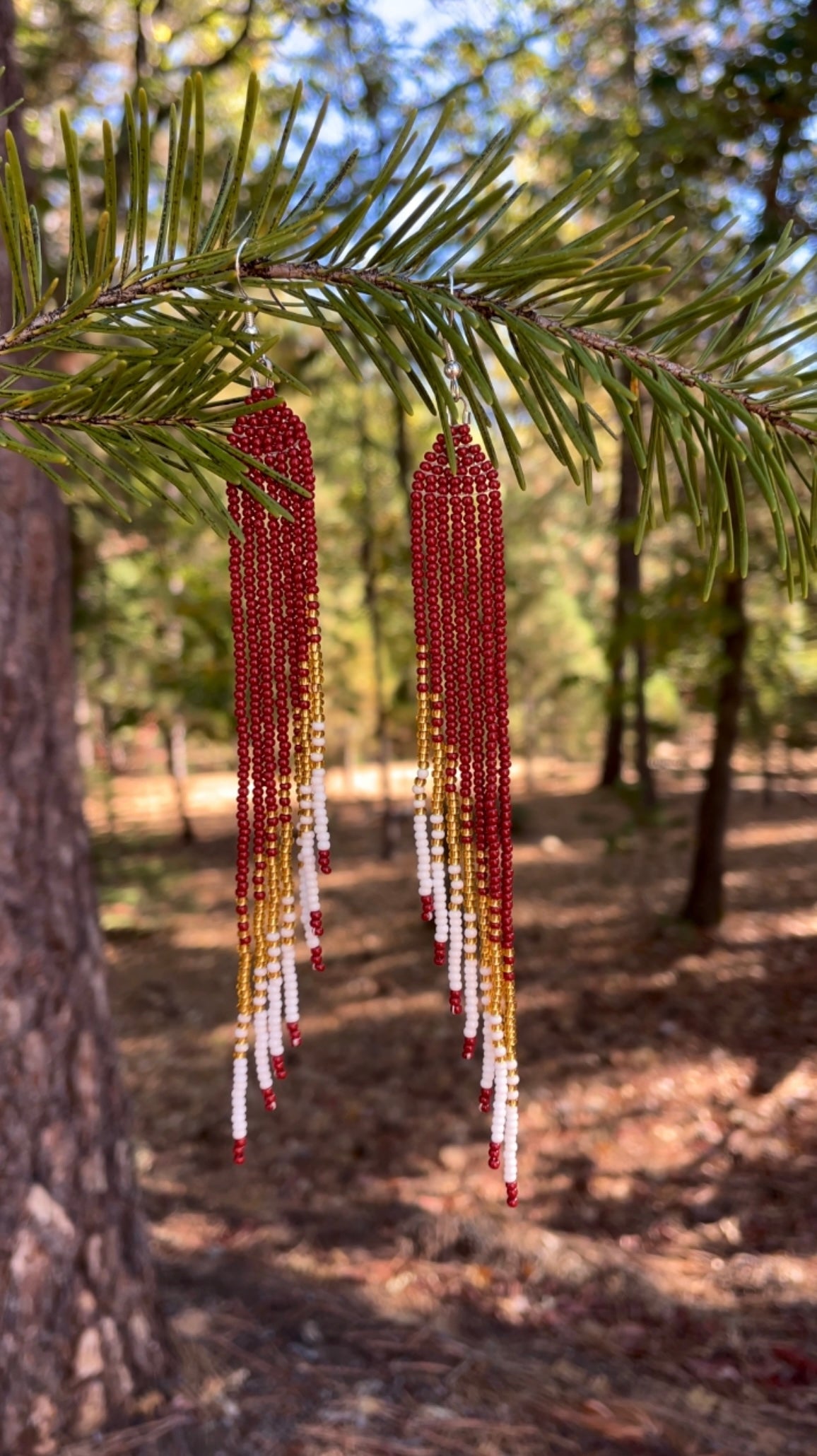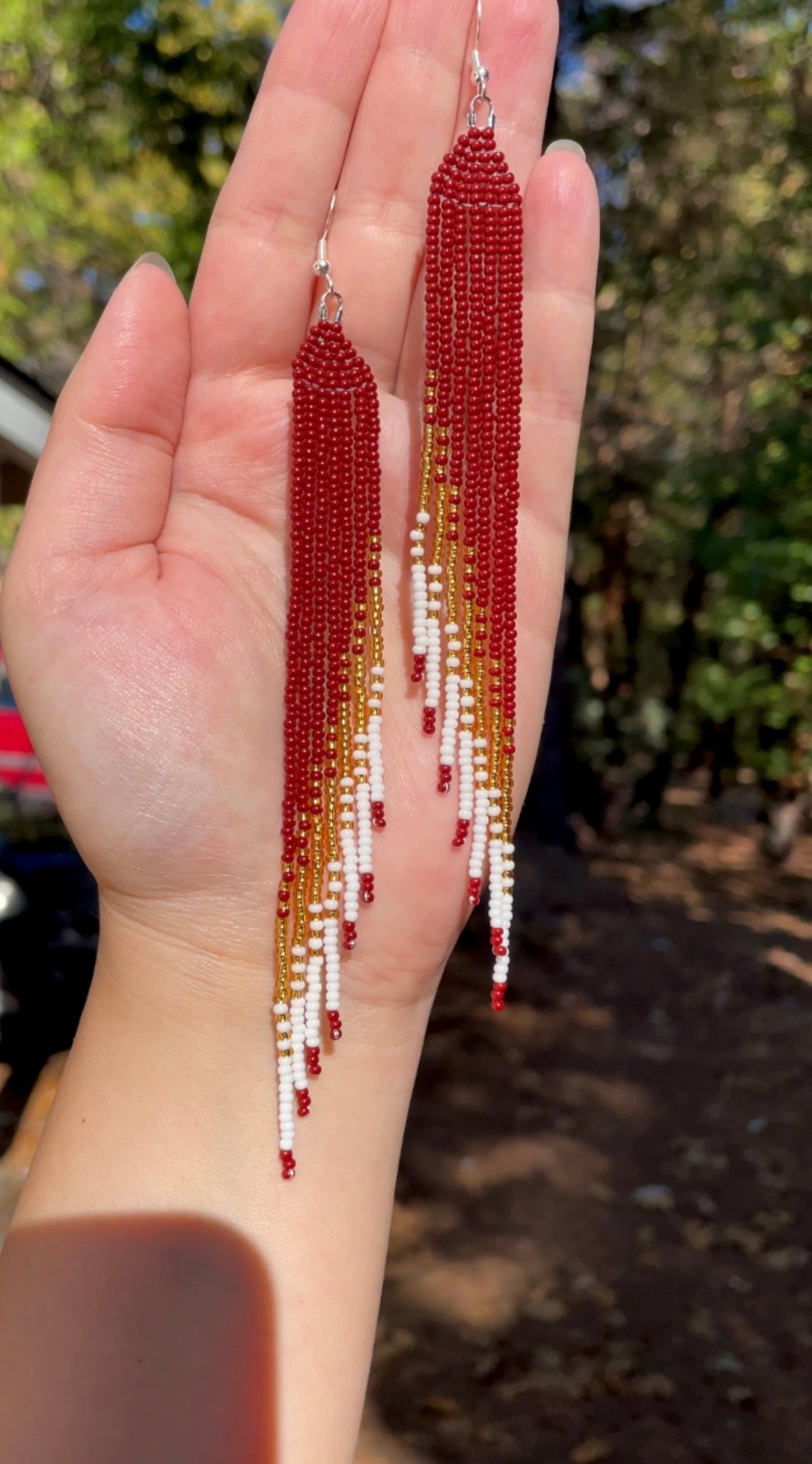 This is a pair of extra long and thin beaded earrings. They follow a gradient pattern that is made of burgundy, gold and white. They are perfect statement earrings. They could fit anytime of year, but their warmer colors really compliment the cooler months. These earrings are 5 inches long.