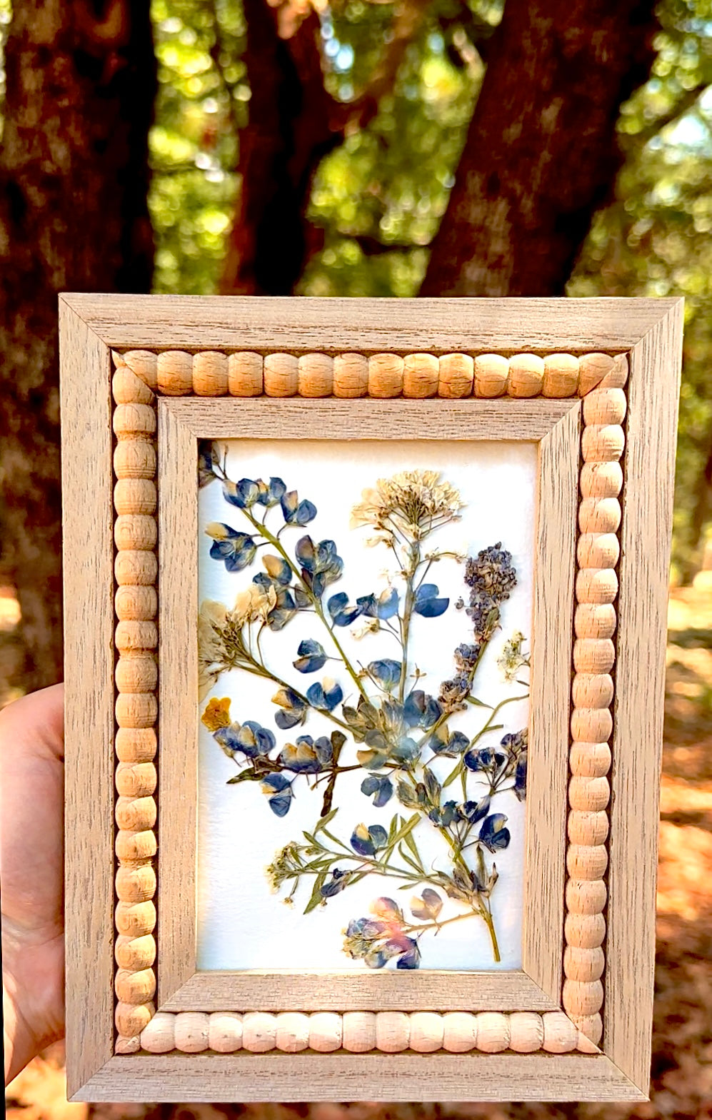 - Materials: Real pressed lupine, candy tuft, and wild pansies; acid-free archival paper; solid wood frame; glass pane